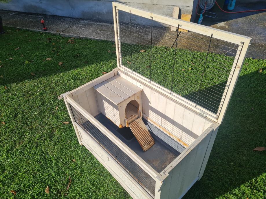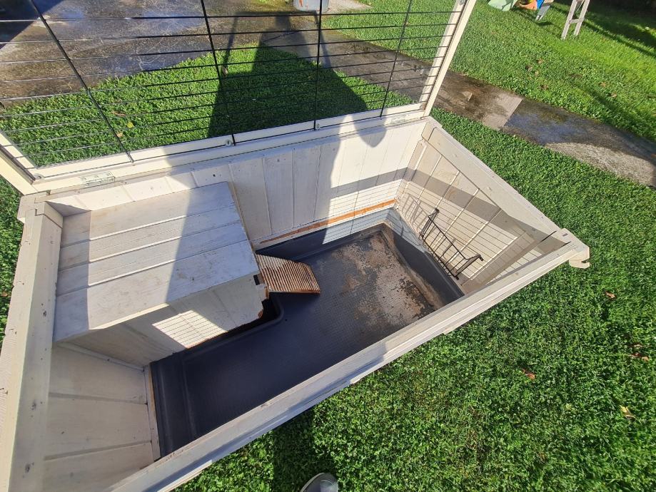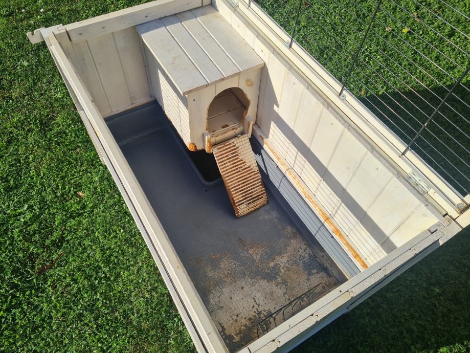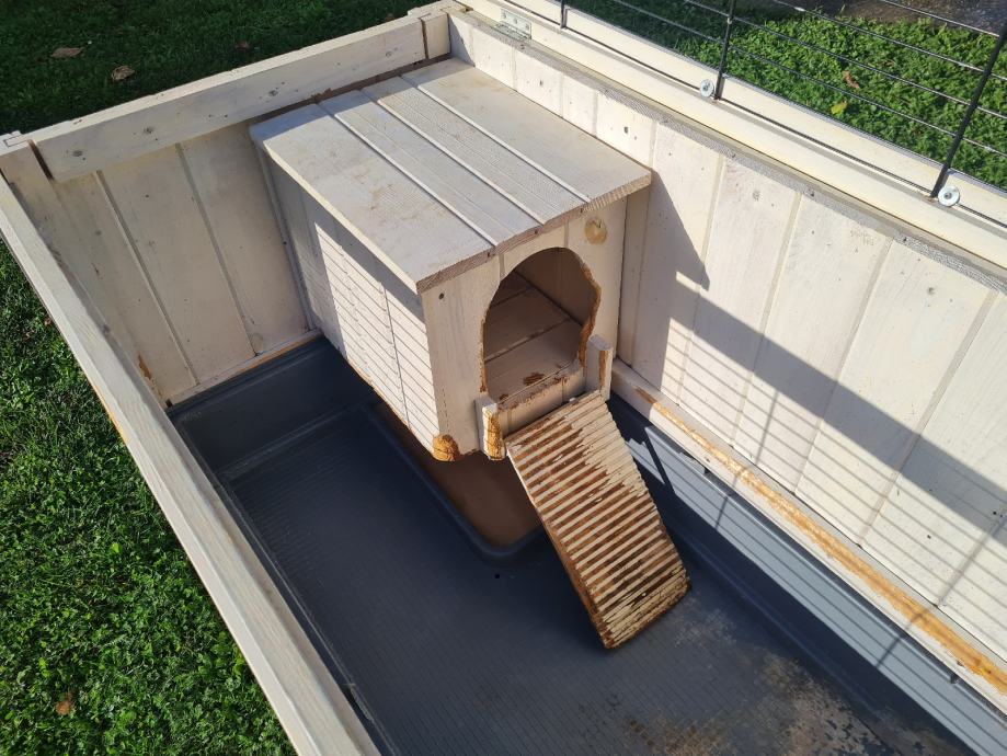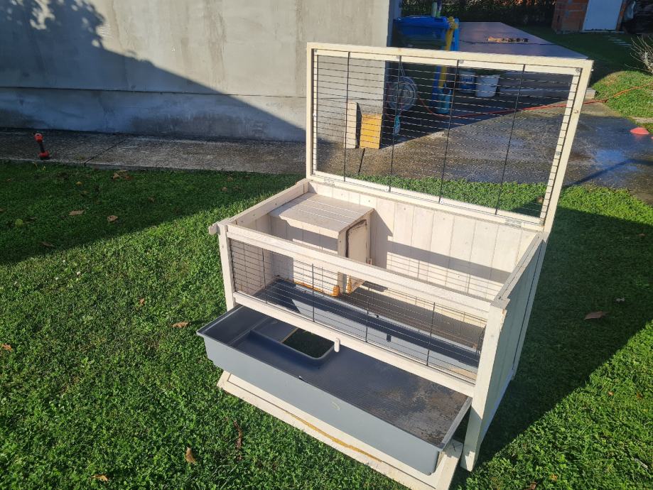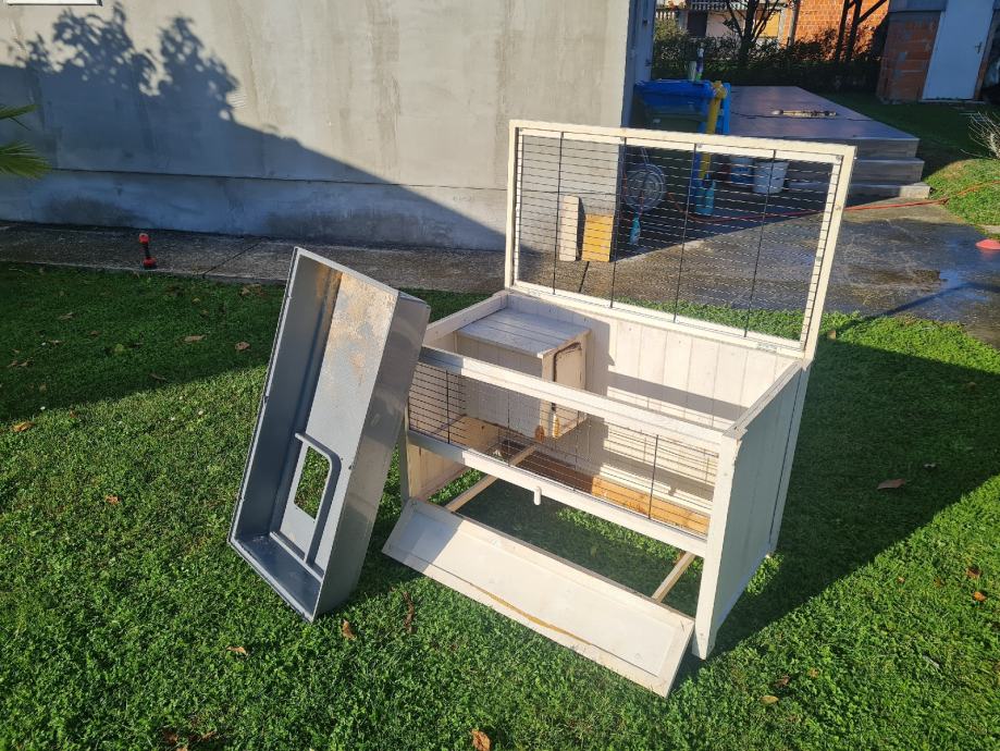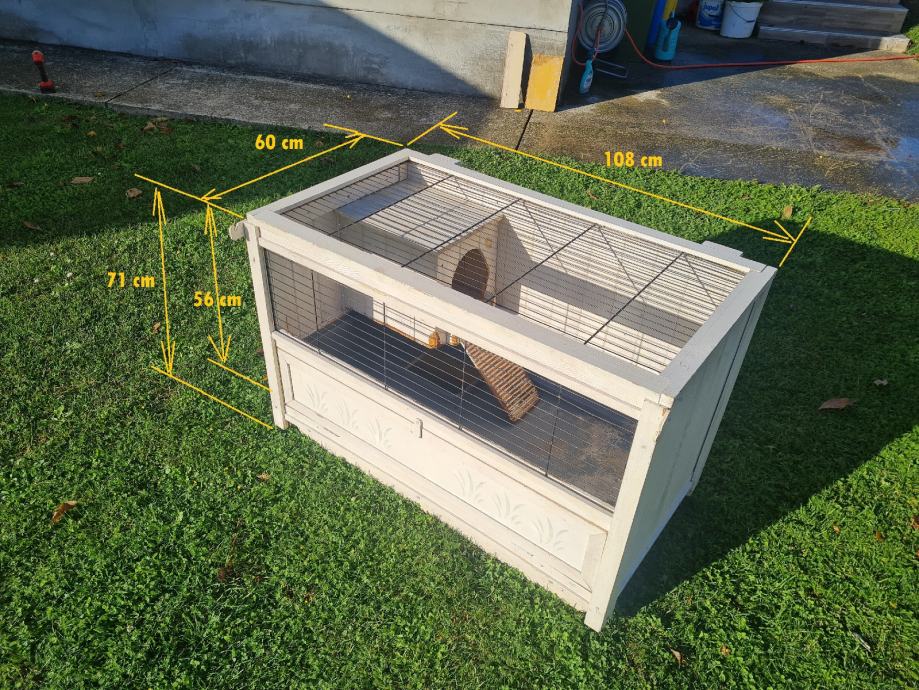 Kućica je dimenzija 108x60x71 cm (visina od donjeg gazišta tj. plasične kade pa do vrha kaveza je 56 cm).