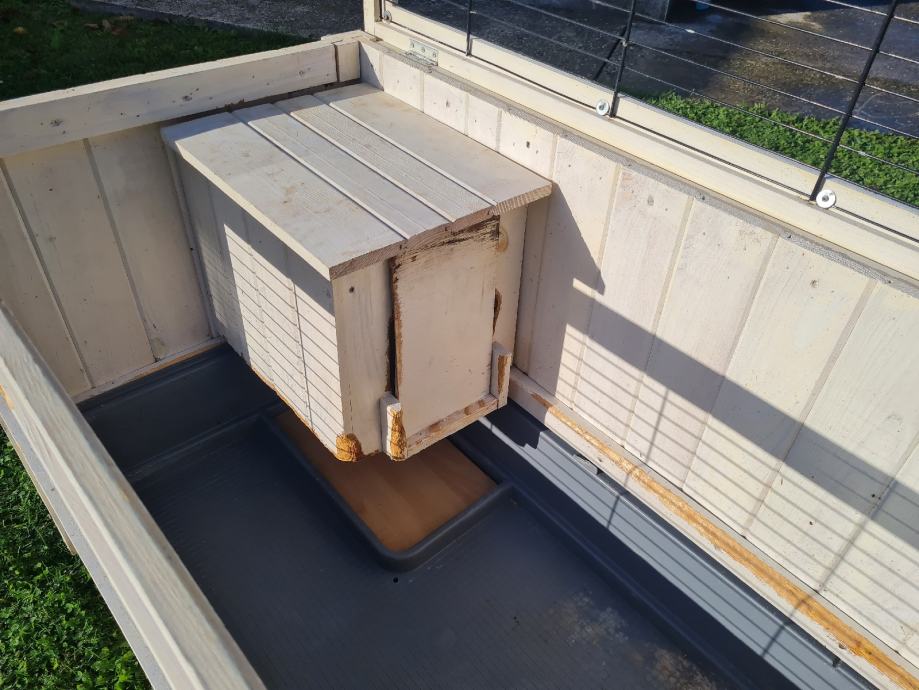 Unutar kućice nalazi se mala kućica za spavanje dimenzija 35x30x35 cm iz koje se spušta drvena rampa za sliazak (kad se drvena rampa podigne služi kao vrata za kućucu za spavanje.)