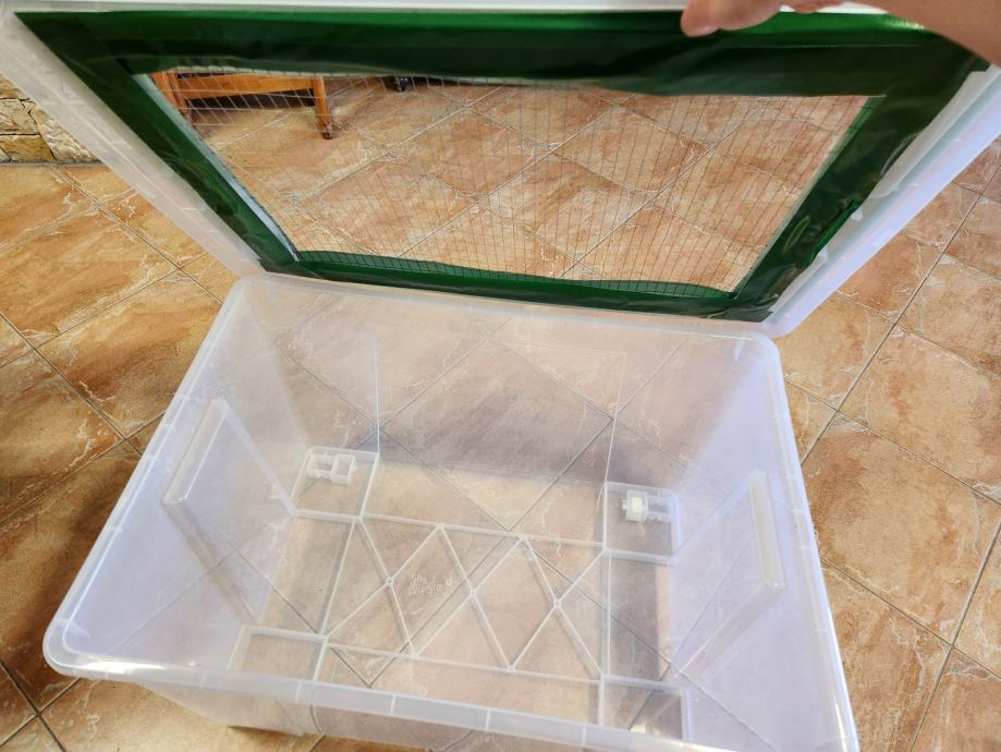 -Nastamba je plastična kutija dimenzija 78x56x43 cm/130 l (Ikea Samla kutija) s prilagođenim poklopcem (postavljena mreža za potpuni dotok zraka i zaštitu od bijega hrčka)