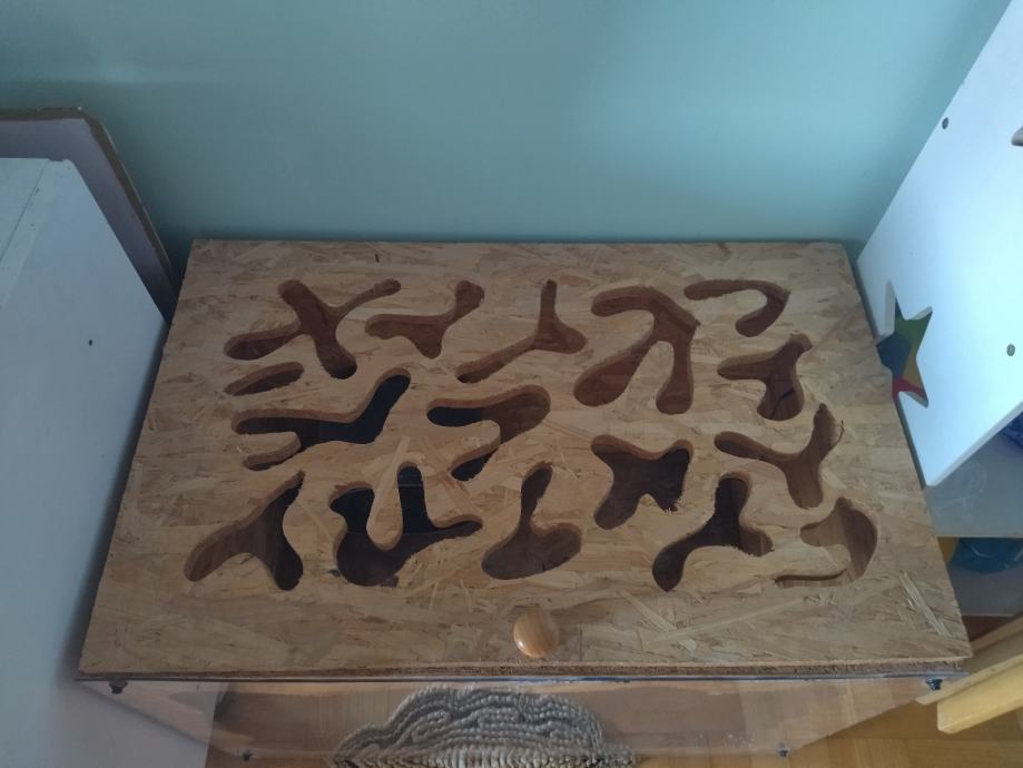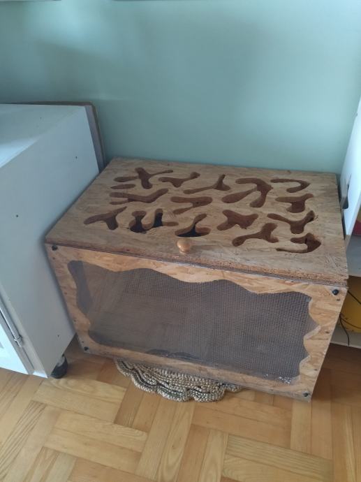 Prodajem ručno izrađenu drvenu nastambu sa izrezbarenim poklopcem i staklenom prednjom stranom koja je bila dom afričkom ježu. Dimenzije 50x80x54