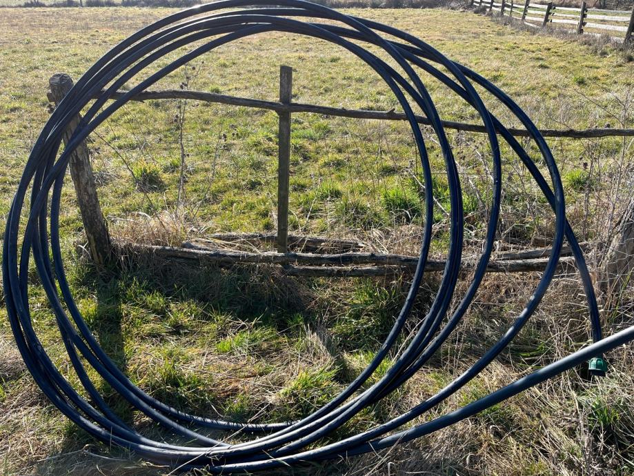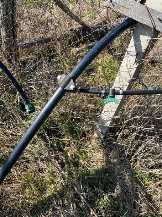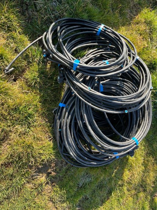 Višegodišnje cijevi za navodnjavanje s kapaljkama kap na kap duljine 25 m, 12 kom. Glavna cijev okiten sa spojnicama duljine 35 m. Bilo u nasadu kupina. Sve 200 €.