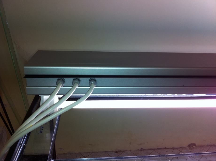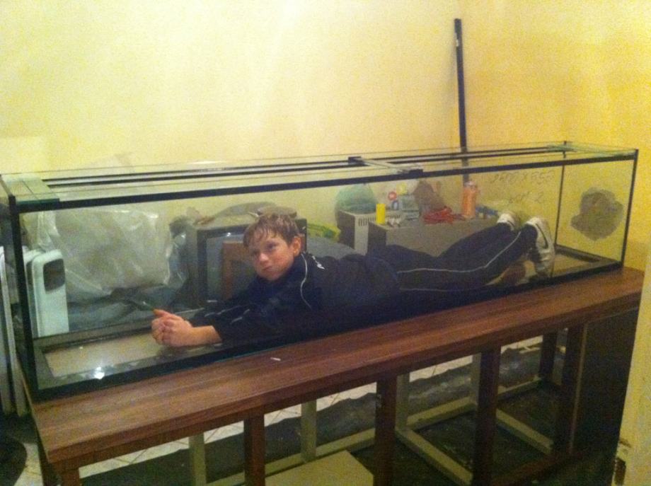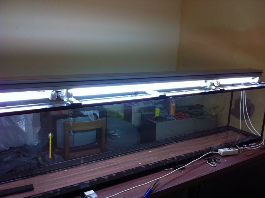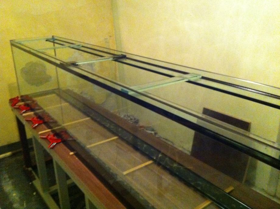 Akvarij dimenzija 250x55x40 cm izrađen od 12mm stakla (15mm dno) sa uzdužnim i poprečnim ojačanjima na dnu i vrhu akvarija. Fuge su napravljene gotovo pa savršeno i 100% ravno, na rubovima se nalaze crni PVC profili tako de se fuge izvana niti ne vide. na akvariju je završen i poklopac koji je ukomponiran s rasvjetom (rasvjeta nije u cijeni).