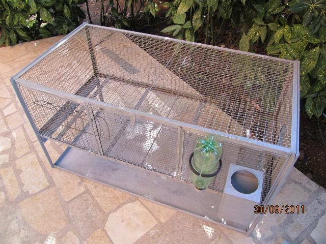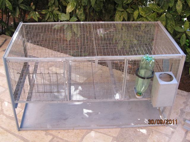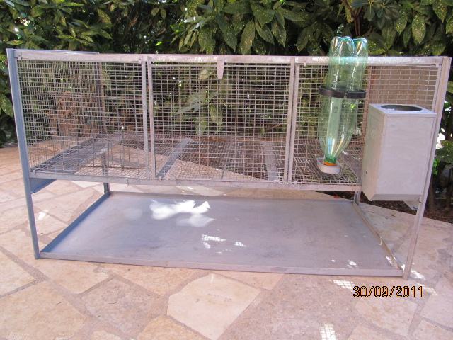 Gajba za kuniće s pripadajućom opremom (hranilica, pojilica) i limenom podloškom za sakupljanje izmeta.