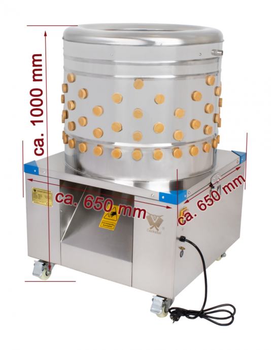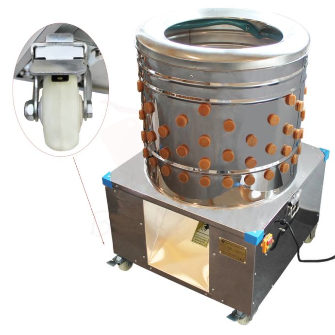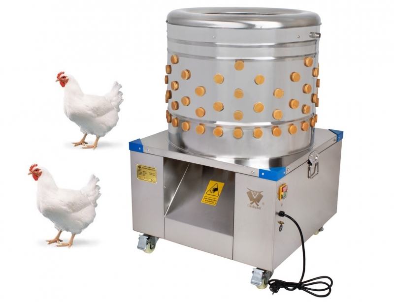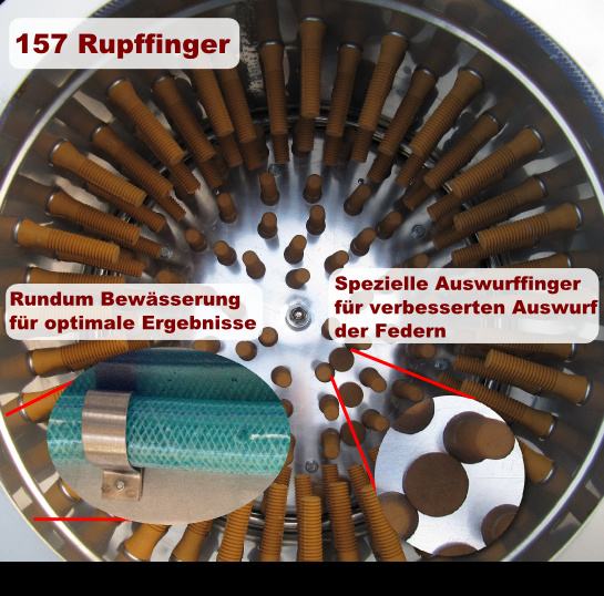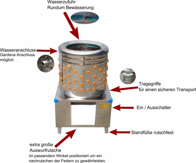 Skidač peradi izrađen je od nehrđajućeg čelika, opremljen sa 147 gumenih prstiju. Zaobljeni gornji rubovi sprječavaju nepotrebno prskanje vode. Berač je opremljen vrlo snažnim monofaznim motorom (1500W). Brzina čupanja je cca. 15 sek.