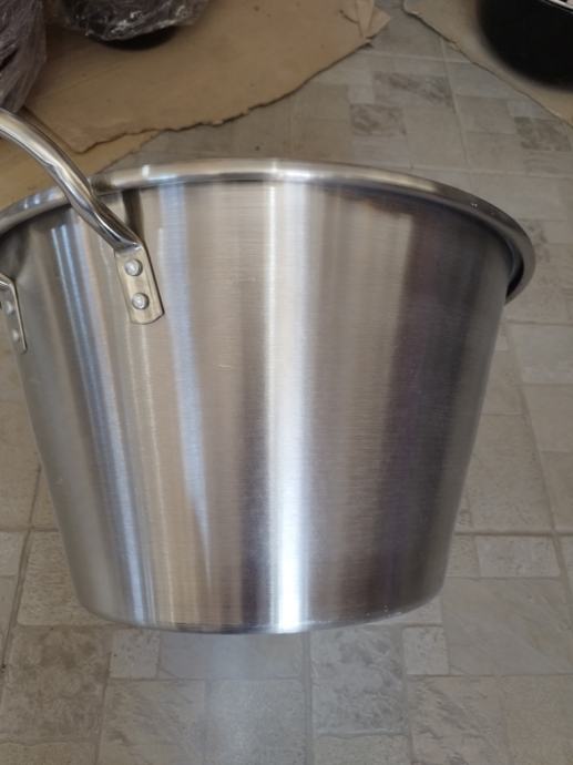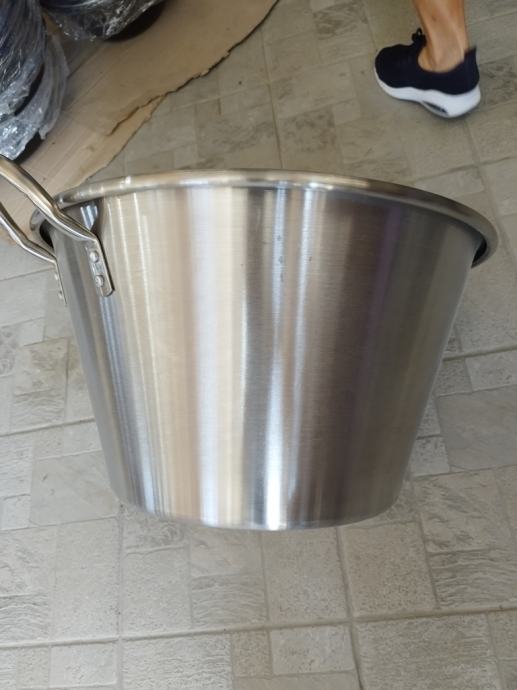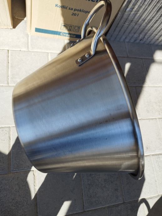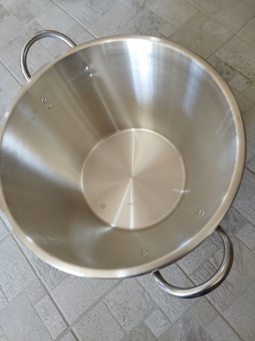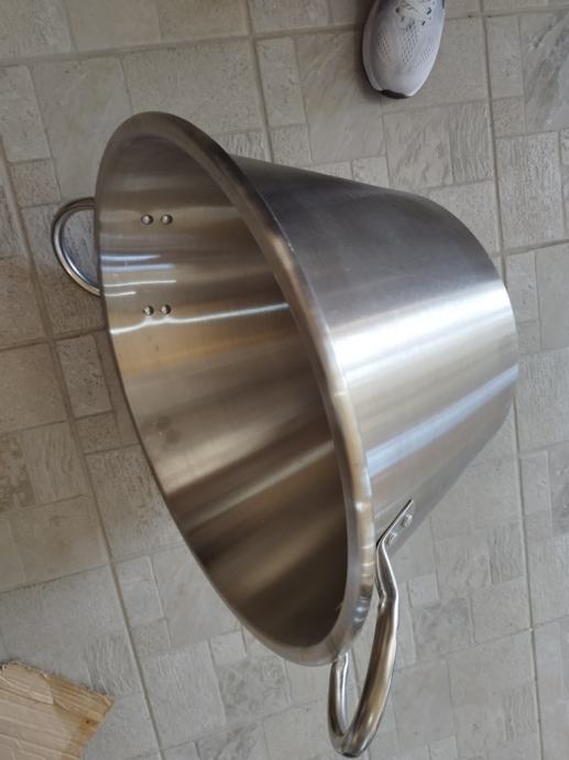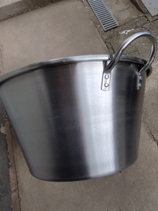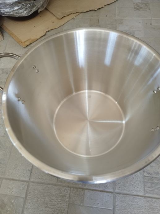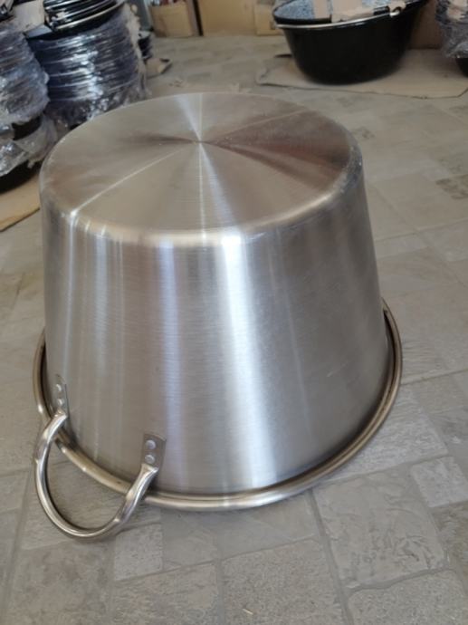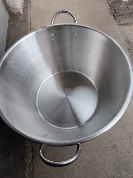 Prodajem inox kotao-lonac-posuda zapremine od 45 litara. Dimenzije posude su visina 32 cm, promjer u gornjem dijelu 52 cm, u donjem dijelu 33 cm. Dno je ravno, materijal prešani i brušeni inox, prehrambeni nemagnetični, debljine 1,5 mm, težina 6 kg. Pogodno za razna kuhanja na otvorenom plamenu, topljenje čvaraka kao i za izradu mješalice za meso. Moguća dostava.