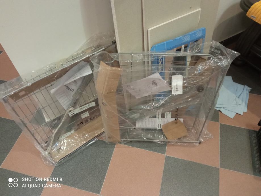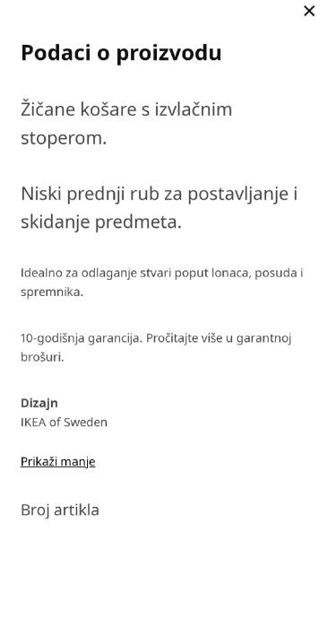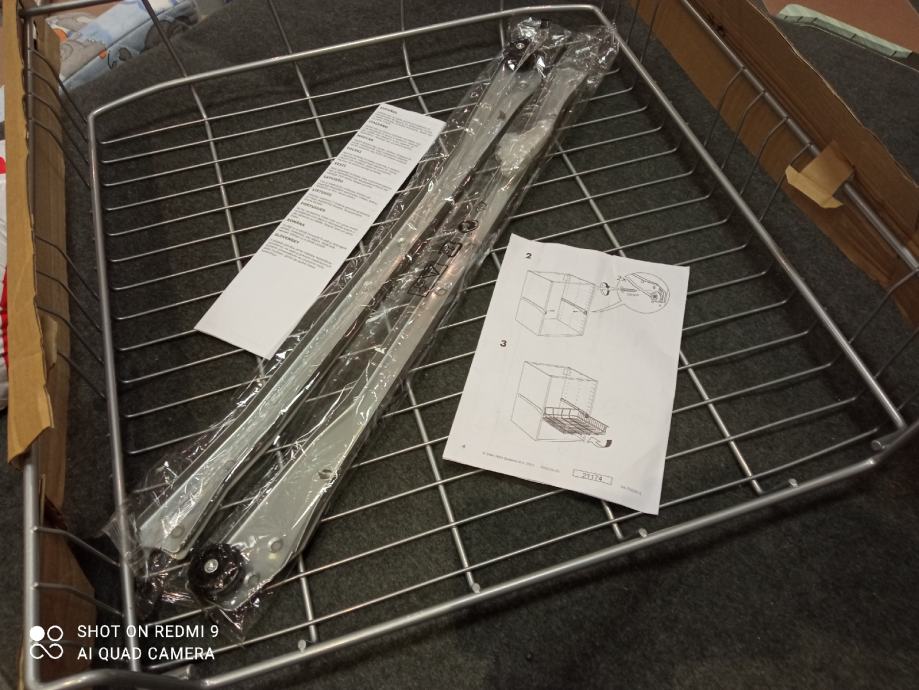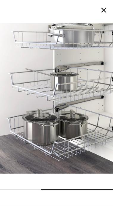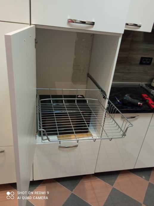 Prodajem dvije potpuno nove izvlačne košare, širine 56,4cm. (Prostor za ugradnju 56,7cm), dubina 56,5cm. (Prostor za ugradnju minimalno 57cm.) ,visina 11cm. Nosivost 10kg. po kosari. Košare su izvlacne, sa stoperima, jako prakticne u kuhinjskim elementima ili raznim ormarima. Na žalost ugradili smo 1 košari i zakljucili da je prevelika( fali nam cc 0.3cm.) za nas element koji je dubine 56,5cm. Cijena 150 kuna po košari a obe košare prodajemo za 290kn. Nalaze se u prizemlju kuce-pristup vozilom ispred ulaza. Za kupnju obe kosare moguća dostava za Rijeku i blizu okolicu. Zvati na 0915376421 poslije 10h.