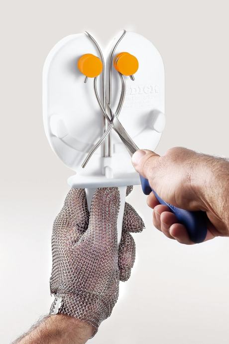 Kao dodatak nudimo držač koji se može koristiti na različite načine i koji se vrlo lako pričvrsti na radno mjesto bez potrebe za posebnim alatom. Držač vam omogućuje da umetnete Master Steel u tri različita položaja, frontalno ili lijevo ili desno. Zbog toga ga je lako integrirati u radni proces i uvijek ga je moguće postaviti licem prema korisniku. Rupa na kraju ručke Master Steel-a omogućuje vezivanje jedinice lancem ili osiguranje u držaču pomoću brave kako bi se spriječila krađa.