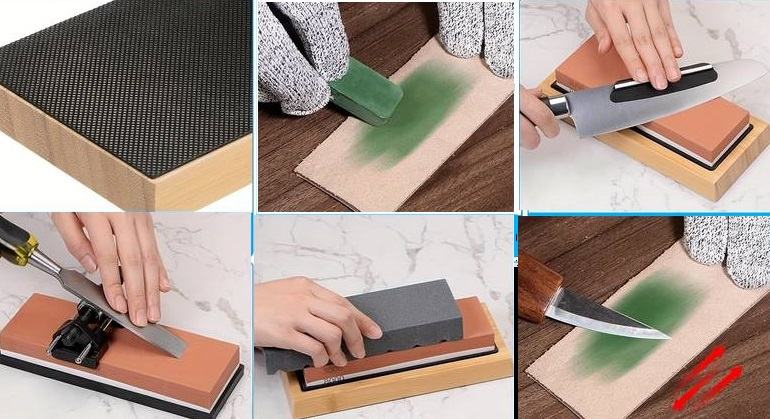 Set također uključuje dvije vodilice, jednu za oštrenje noževa, a drugu za oštrenje dlijeta ili alata. Kamenje ima jastučiće protiv klizanja, što znatno olakšava rad.