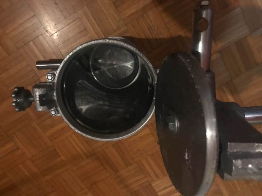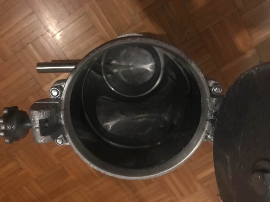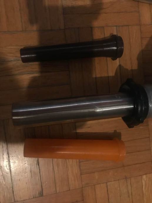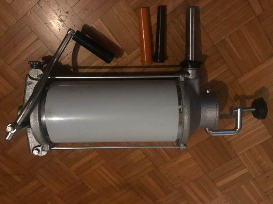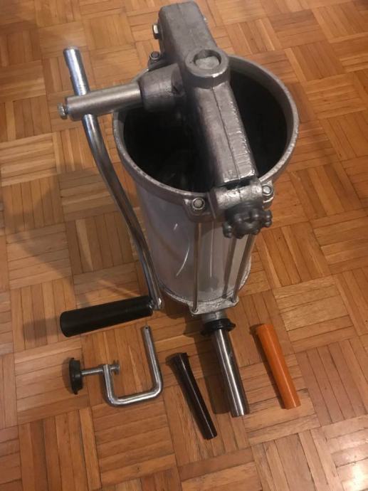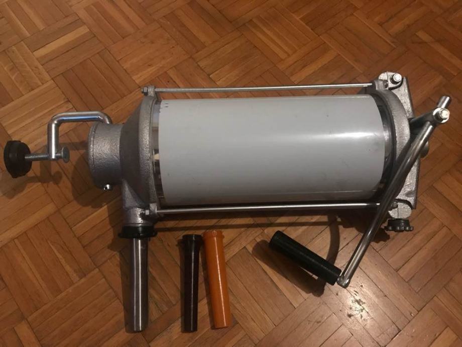 Top ili punilica za kobasice (meso), uspravna/vertikalna, kapaciteta 9 kg, izrađena od inoxa, aluminija i čelika. S ojačanjima sa strane od 4 aluminijske cijevi, koje ojačavaju i stabiliziraju top/punilica prilikom samoga punjenja. Zapremina cilindra/rezervoara iznosi 9 kg. Postolje, klip i gornja vodilica su izrađeni od aluminija. Cilindar/rezervoar je izrađen od nehrđajućeg čelika - inoxa. Škripac/pričvršćivac za stol, ručka za vrtenje i vodilica klipa su izrađeni od čelika. U kompletu se još nalaze i tri nastavka/lijevka/tuljca za deblju i tanju kobasicu, od kojih su dva plastična i jadan metalni za krupnije kobasice (kulen, svargla/prezvurst). Unutarnje dimenzije cilindra/rezervoara su: 35 x 17 cm, a ukupna visina kompletnog topa/punilica je 50 cm. Sve je jednostavni za upotrebu. Novo! Zapakirano! NAPOMENA: Ovo sto se vidi s vanjske strane na inox/fosfrei je originalna tvornička zaštitna folija! Povoljno za 990 kn! Besplatna dostavljam na područje grada Zagreba. Za ostale dijelove RH, šaljem putem HP ekspresa.