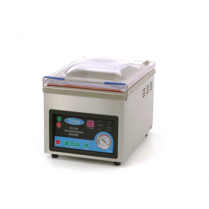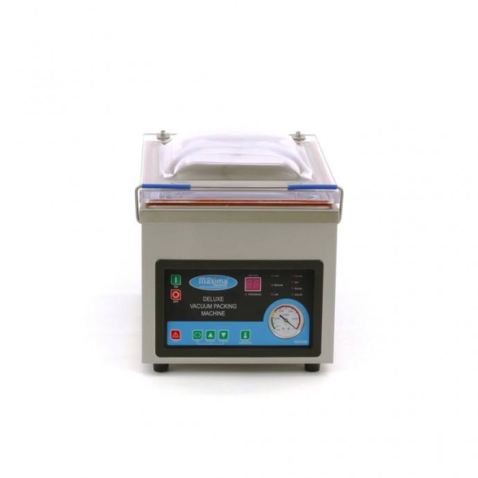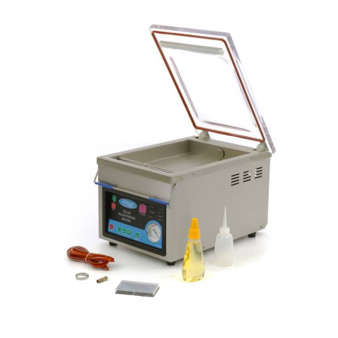 MVAC 200, stroj za vakumiranje. Stroj za vakumiranje, stolni model. Ovaj stroj za vakuumsko pakiranje može se u potpunosti prilagoditi vašim potrebama. Vrijeme vakuumskog pakiranja, vrijeme zatvaranja, temperatura zatvaranja i temperatura hlađenja su podesivi. Stoji na četiri gumene noge i teži 40 kilograma, što ga čini sigurno zaštićenim od klizanja.