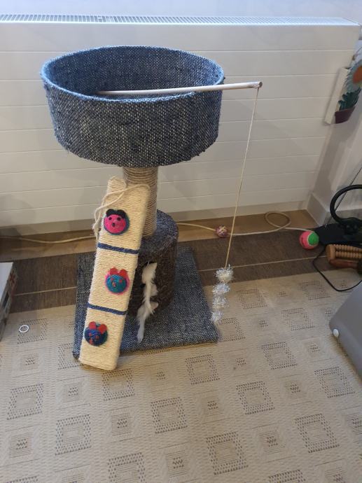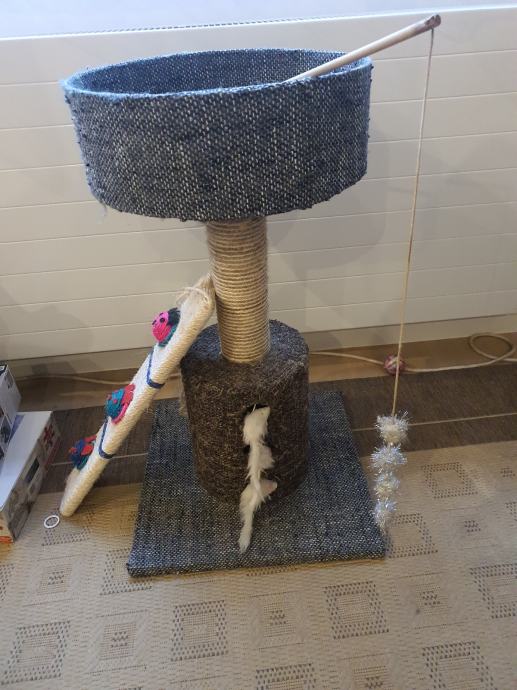 Grebalica za mačke s tanjurićem za ležanje visina 70 cm, promjera 37 cm obloženo mekanom tkaninom malo rabljeno. Uz to dodatna grebalica sa cvjetnim ukrasima duljina 50 x 10cm siroka.