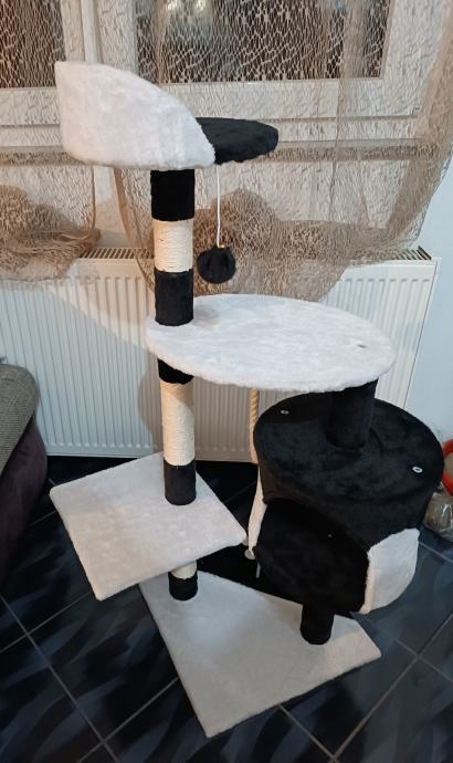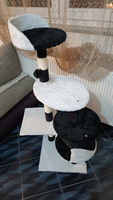 Prodajem novu grebalicu za mačke s više razina i platformi. Kombinacija bijele i crne boje, s plišanim površinama za odmor i stupovima omotanim konopom za grebanje. Ima kuću za skrivanje, visoku platformu za promatranje i dodatnu policu sa zaštitnim rubom. Stabilan i funkcionalan komad namještaja koji pruža mačkama prostor za igru, odmor i održavanje kandži.