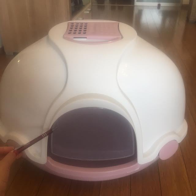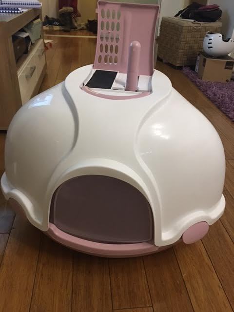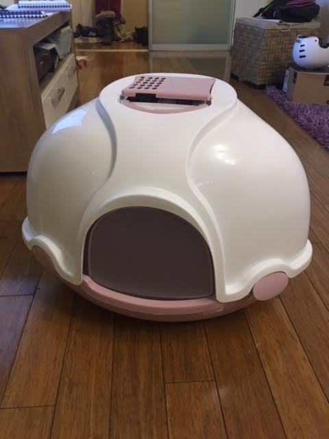 rodajem zatvoreni wc za mačke, izuzetno kvalitetan i očuvan. Na prednjoj strani nalaze se pokretna vrata tako da se pijesak ne rasipa izvan kutije te ne šire se neugodni mirisi. s gornje strane ima dodatni filter koji zadržava miris kako se ne bi osjetio unutar prostorije u kojoj se nalazi taj toalet. Ujedno imate i lopaticu za čišćenje koja se nalazi ispod poklopca
