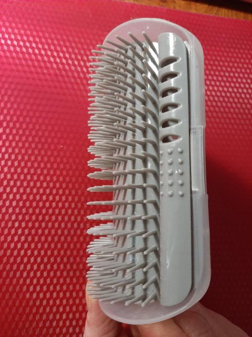 Kutni češalj za mačke. Monitra se npr. na nogu stola ljepljivom trakom i vijcima koji su priloženi uz proizvod. Uz to se dobije i vrećica mačje trave koja se stavi u češalj.