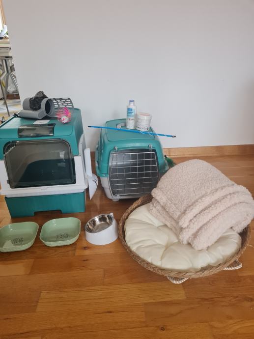 Kontejner,wc,lopatice za čišćenje wc 3 kom.igračke,posude za hranu i vodu,krevetić,jastuk,dekica mekana,kozmetika ,pijesak,miris za wc,sve novo prodajem.