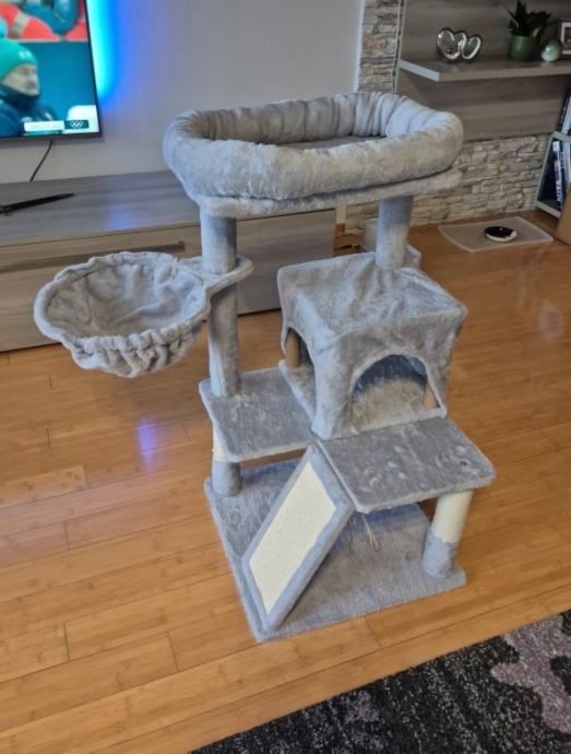 Prodajem novu penjalicu za mačke u sivoj boji s plišanim površinama. Penjalica ima više razina s ležaljkama, male kućice s ulazom za skrivanje i odmor, te dasku za oštrenje kandži.
