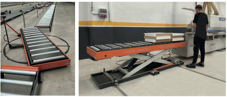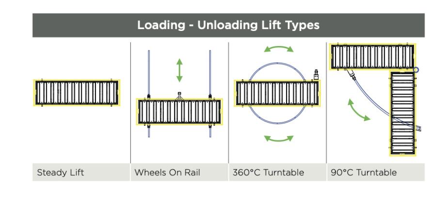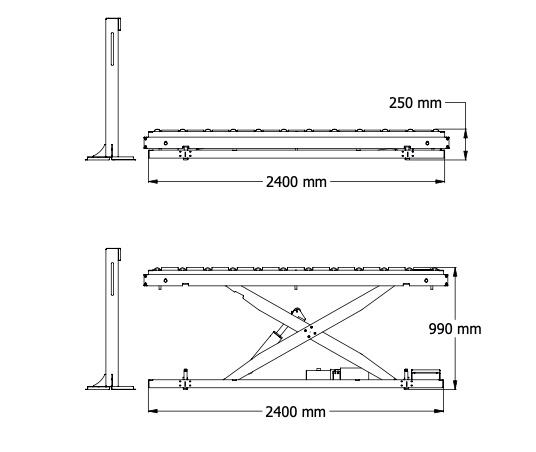 Valjci se aktiviraju dok je dizalo u donjem položaju. Proizvodi na dizalicama mogu se kretati samo u ovom stanju. Ako se hidraulično podizanje podigne, valjci se spuštaju i proizvodi se ne pomiču u bilo kojem smjeru. Ova dizala mogu raditi s pokretnim linijama zahvaljujući radnoj visini od 250 mm do 990 mm.