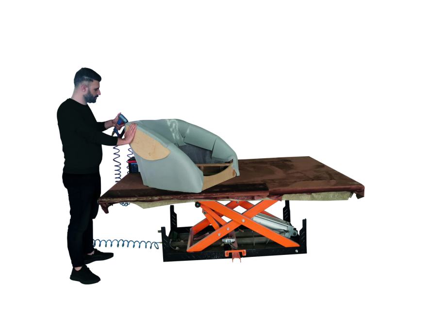 Radni stol, koji se diže i spušta pomoću pneumatske energije i općenito se koristi za presvlake sofe. Omogućuje rad u rasponu od 800 x 1500 mm