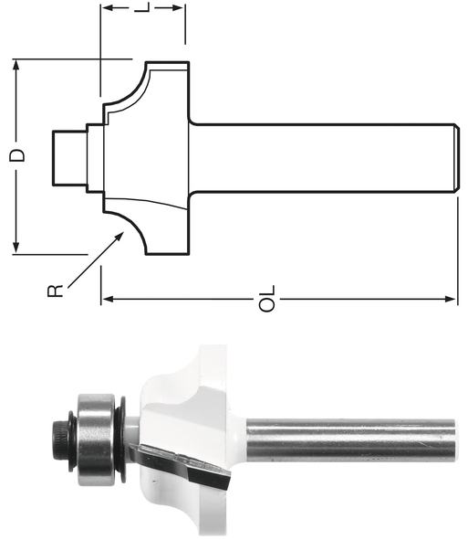 Dužina (OL) 55,3 mm Širina (D) 28,6 mm Radna dužina (L) 13 mm Polumjer (R) 4 mm Prihvat 6 mm Broj oštrica 2 Maks. broj okretaja 18.000 min-1 Promjer kugličnog ležaja (H) 12,7 mm Za model RT0700C, RP2300FC, RP2301FC