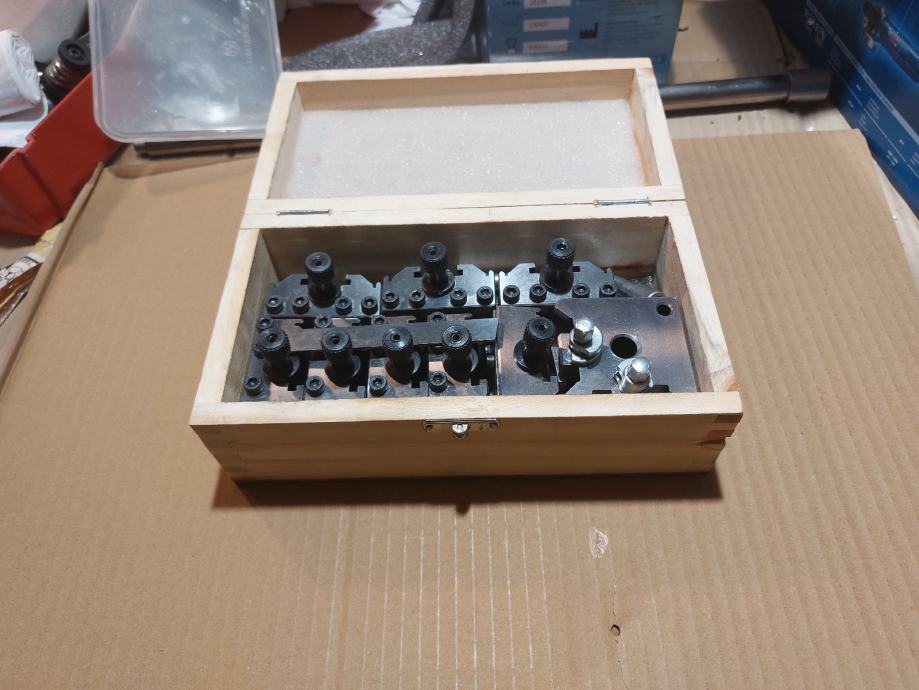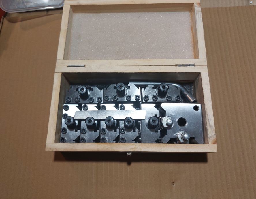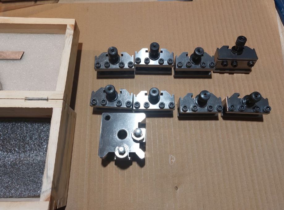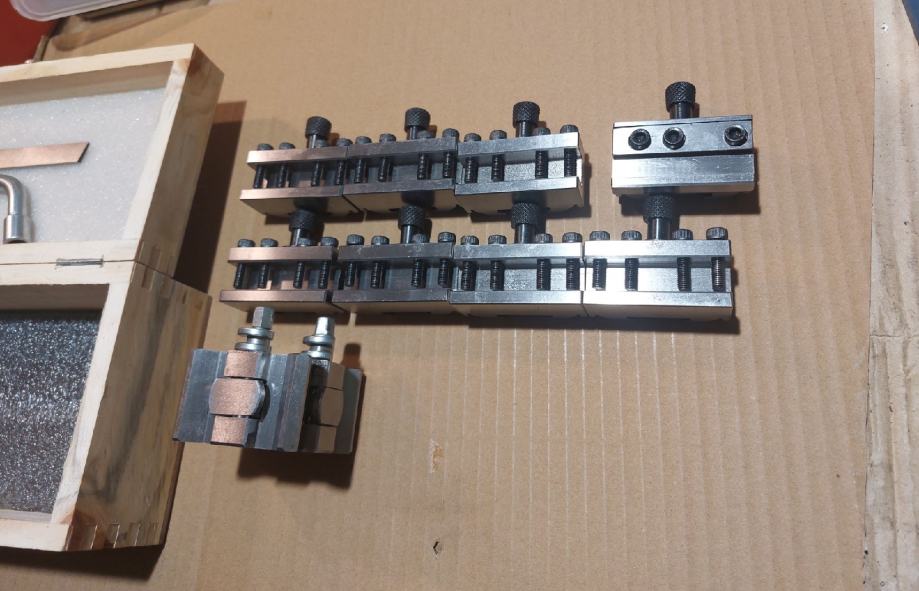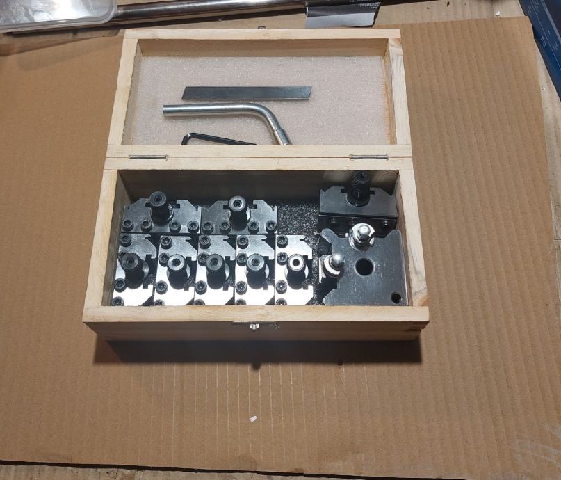 Centrala i 8 nosača noževa od okaljenog čelika za hobi tokarske strojeve čija je visina centra od 90 do 110mm. Kocka je veličine 58x58mm a centralna rupa promjera 11mm. Prima noževe do visine 12mm.