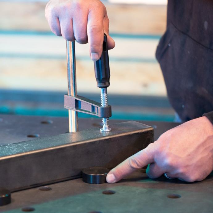 Robusna konstrukcija s poniklanom osovinom, profiliranom vodilicom i ergonomski oblikovanom ručkom osigurava dug radni vijek i omogućuje preciznu fiksaciju obratka na stolu za zavarivanje.