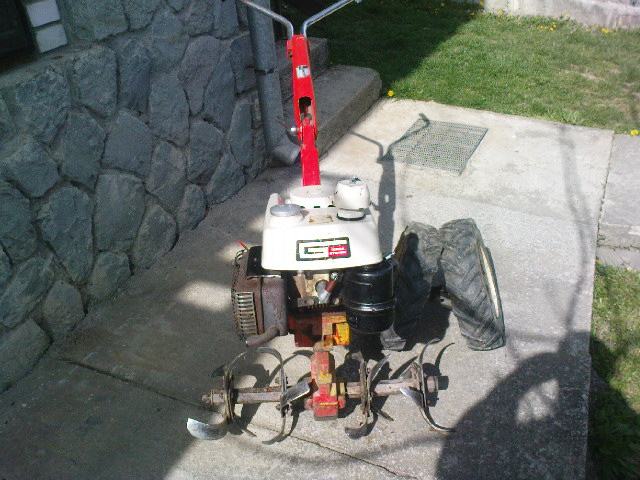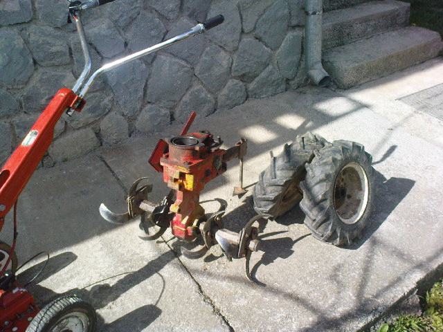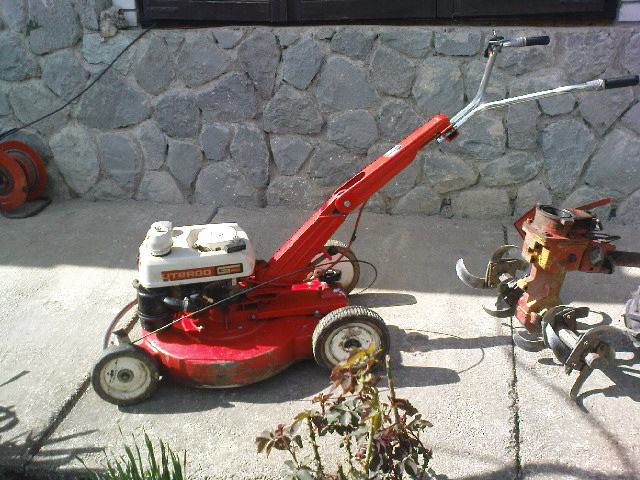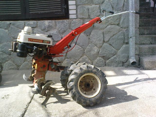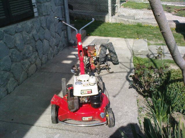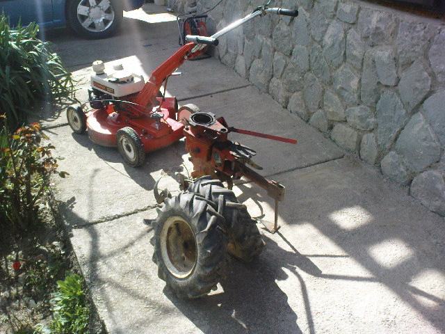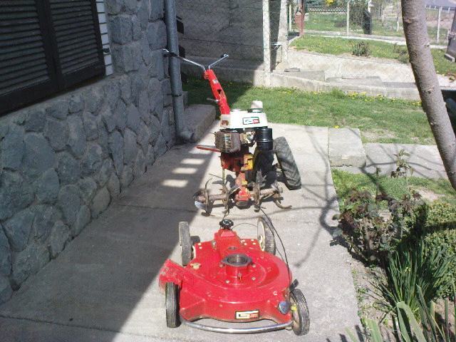 Gutbrod motokultivator+samohodna kosilica.Multi funkcionalni stroj,samo prebacite motor po potrebi.Mogučnost kopčanja prikolice pošto ima 3 brzine naprijed i 1 rikverc.Brzina vožnje oko 15-20 km/h.Motor je snage 5 konja i ima prijenos preko zubčanika tako da je dosta jak.Na kosilici mogučnost regulacije brzine hoda.Motor je odličan i sve je jako sačuvano