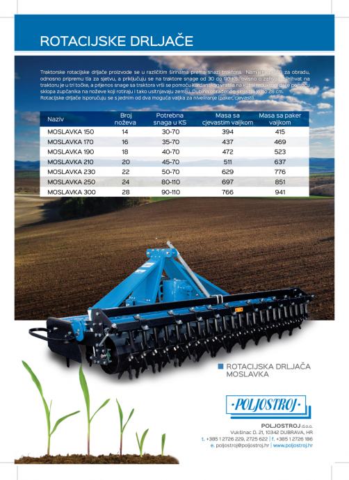 Traktorske rotacijske drljače (rotodrljače, rotobrane) proizvode se u širinama od 130 do 300 cm za traktore od 30 do 110 KS.
