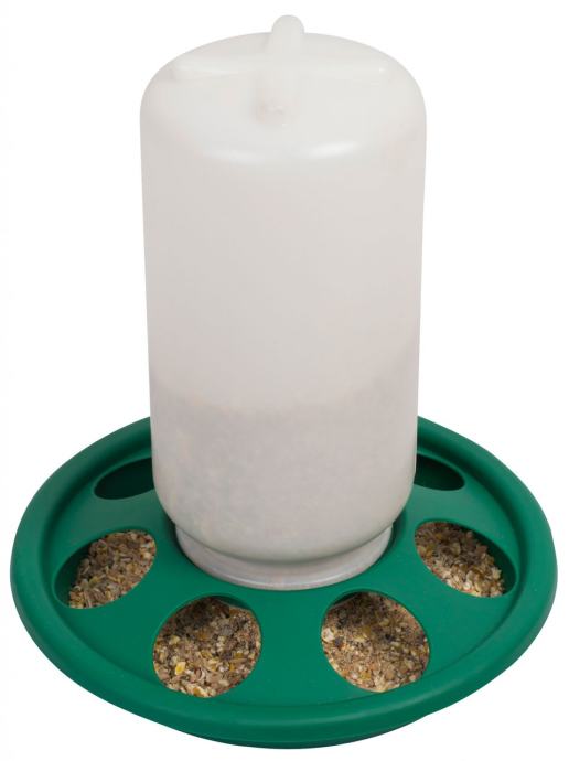 Hranilica ima sedam rupa za piliće da kljucaju hranu. U usporedbi s pojilicom za pile, ove rupe su nešto veće. Hranilica je prikladna za 1 kg hrane i kompletan je set koji se sastoji od boce, hranilice s rupama i dna. Proizvod radi vrlo jednostavno: Napunite bočicu hranom i okrenite okrugli prsten s rupama na bočici. Kliknite bazu na prsten i okrenite cijelu stvar. Pilići sada mogu koristiti hranilicu!