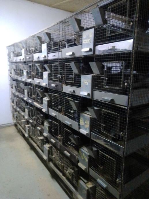 Kavezi 2x1 za rasplod 100 mjesta (malo korišteni). 80x50 (standard). Posude-tacne 50% inox, 50% PVC. Svih 420 kaveza imaju pojilice i svu ful opremu za uzgoj. Šest postolja pocinčanih za regale na kotačima.