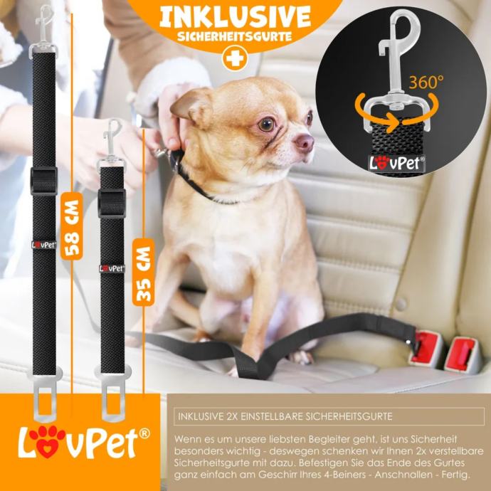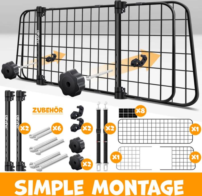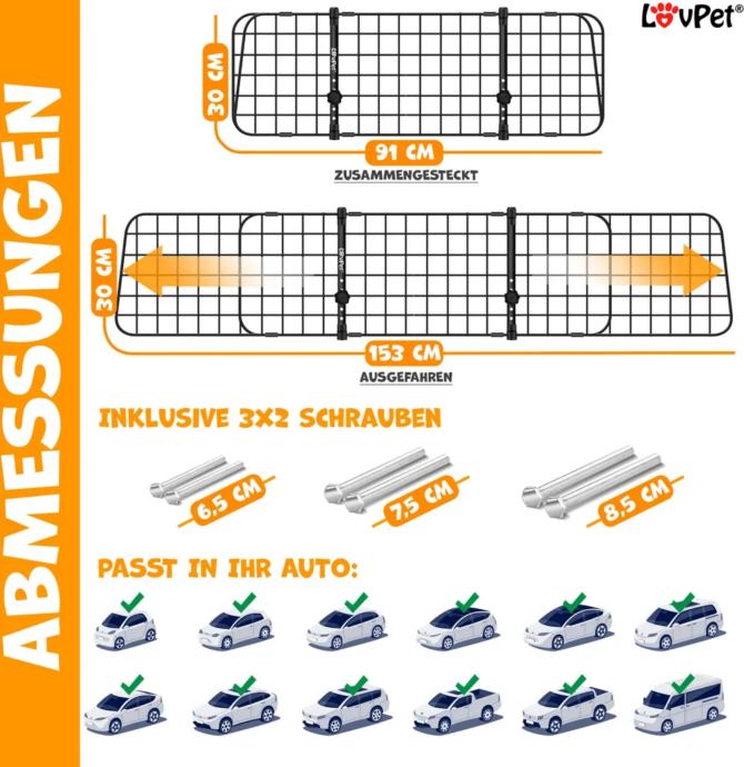 Lovpet® Car Dog Gate, Sigurnosna Vrata za Auto, Pregradna Rešetka, Univerzalna, Podesiva širina, Naslon za glavu, Prtljažnik Rešetka Automobila, Dimenzije 30 x 91-153 cm, Rešetka Prtljažnika, + 2 x Sigurnosni pojasevi za pse, Crna