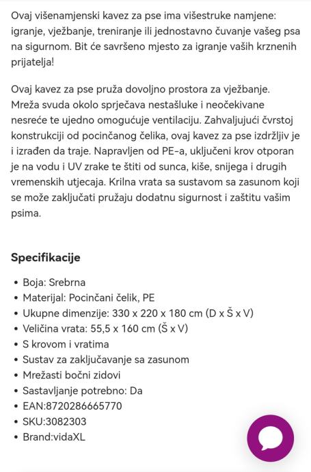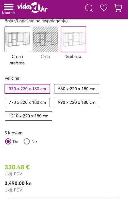 Prodajem novi, neotvoreni boks za pse dimenzija 330x220x180. Boks ima krov, vidljivo na slikama. Materijal: pocinčani čelik. Potrebno samostalno postaviti boks. Dolazi u dva paketa od 25kg. Cijena nije fiksna.