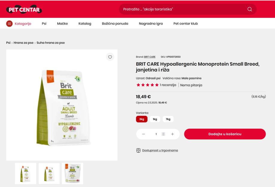 Cijena jednog paketa od 3 kilograma u Pet Centru je 18,49 €.