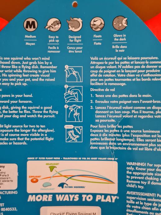 Baca se kao frizbi. Zbog svog oblika ima specifičan spin što psima predstavlja zabavniju igru.