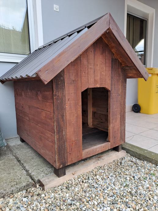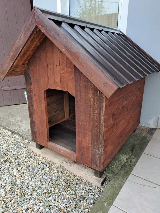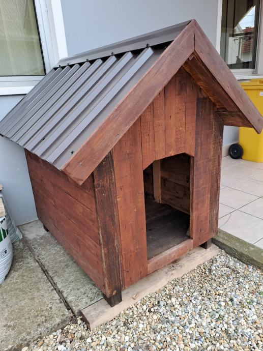 Kućica za psa većega, dimenzija: 100×80, napravljeny od daske i pokrivena osb pločama pa limom.