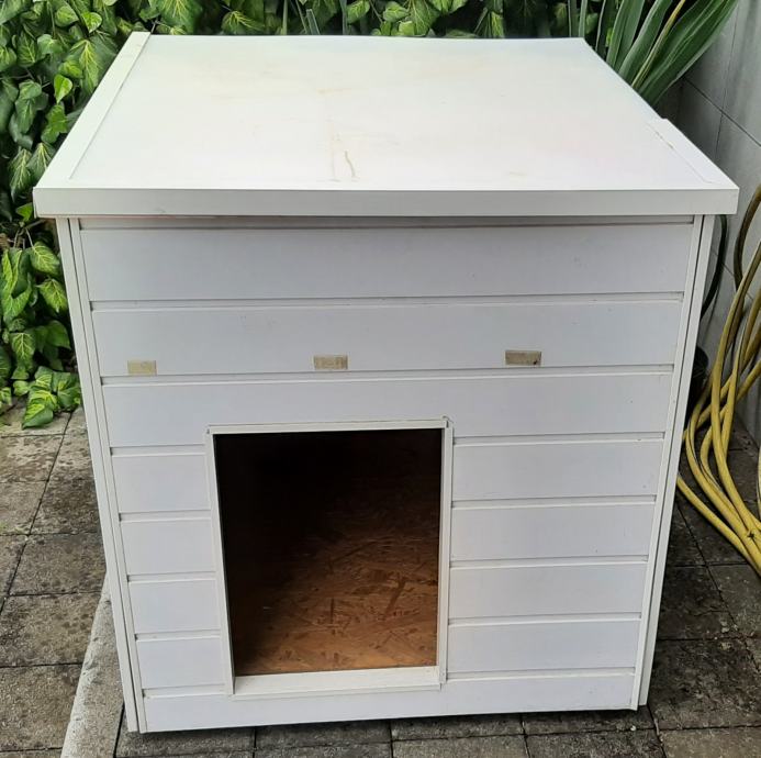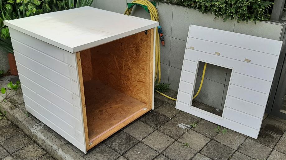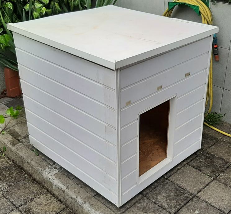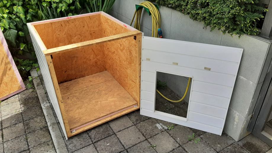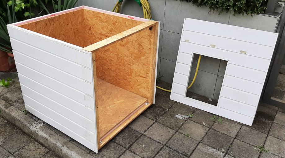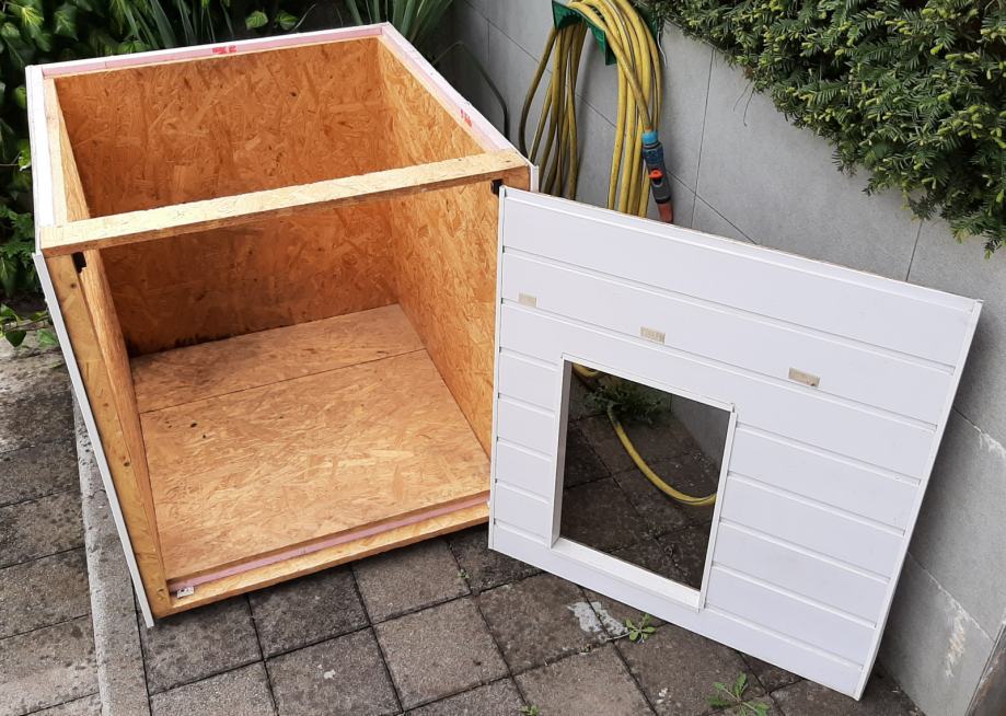 Pseća kućica (kućica za pse) s termoizolacijom. Konstrukcija je od OSB ploča, termoizolacija je stirodur debljine 2 cm. S vanjske strane su bijeli plastični sendvič paneli. Pokrov je OSB ploča + stirodur + s gornje strane PE bijela ploča. Ta ploča se odlijepila, potrebno ju je zalijepiti ili, po želji, staviti neki drugi pokrov (šindru i sl.).