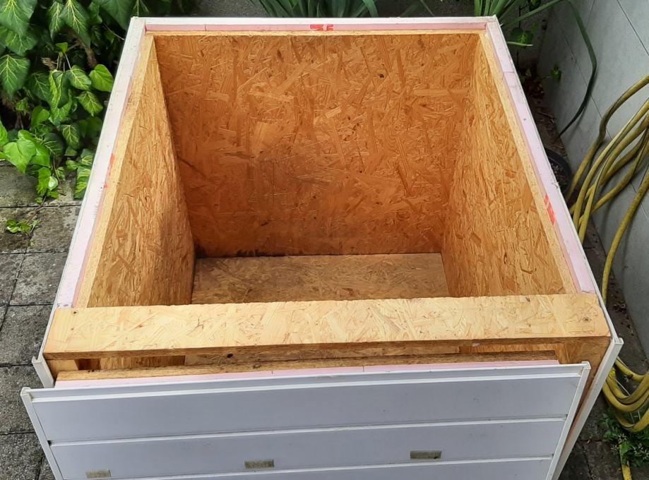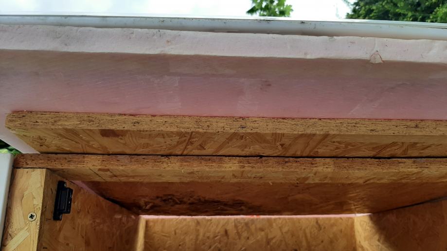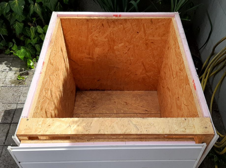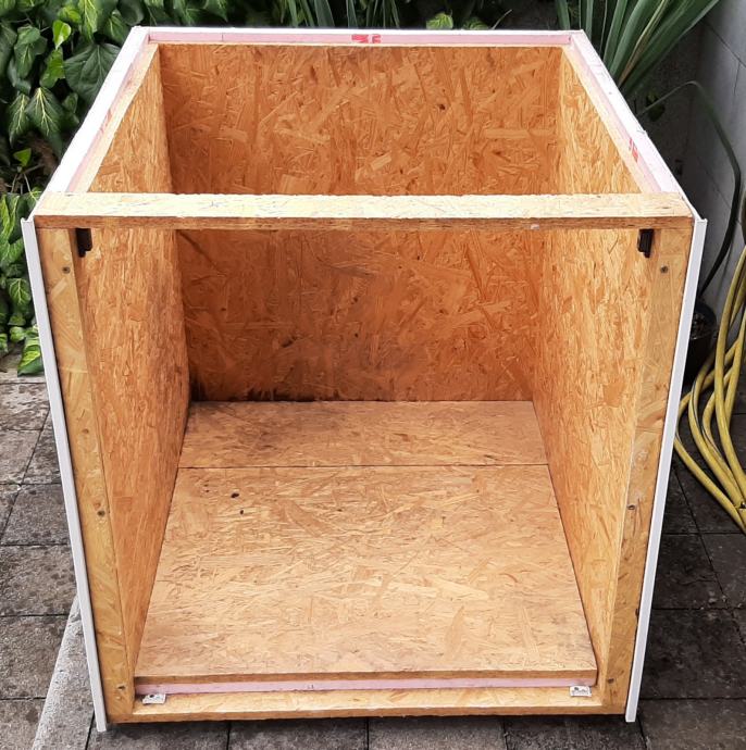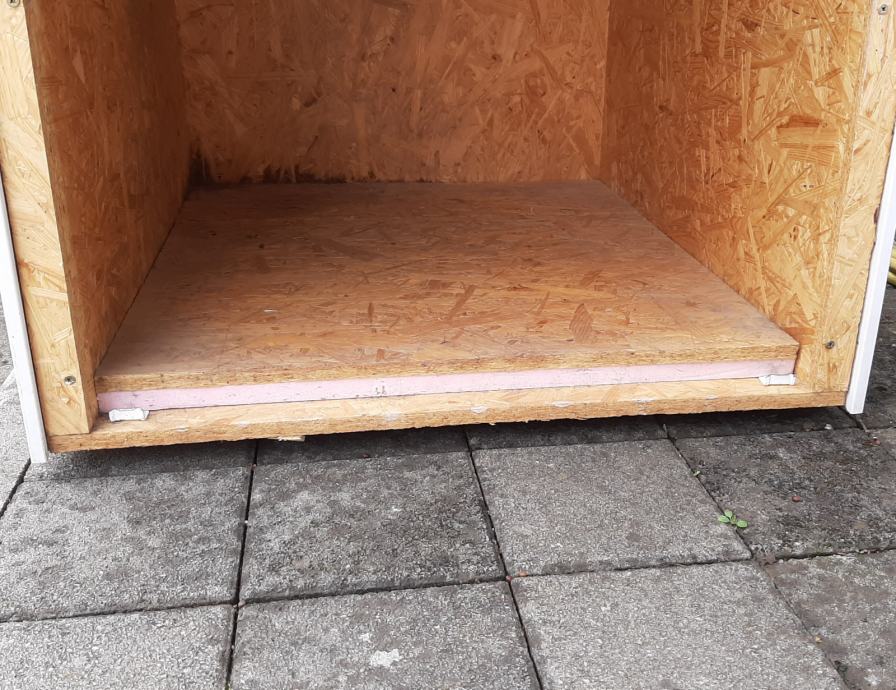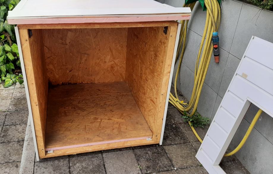 Pseća kućica (kućica za pse) s termoizolacijom. Konstrukcija je od OSB ploča, termoizolacija je stirodur debljine 2 cm. S vanjske strane su bijeli plastični sendvič paneli. Pokrov je OSB ploča + stirodur + s gornje strane PE bijela ploča. Ta ploča se odlijepila, potrebno ju je zalijepiti ili, po želji, staviti neki drugi pokrov (šindru i sl.).