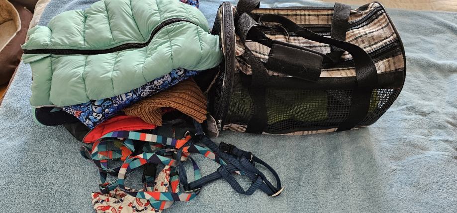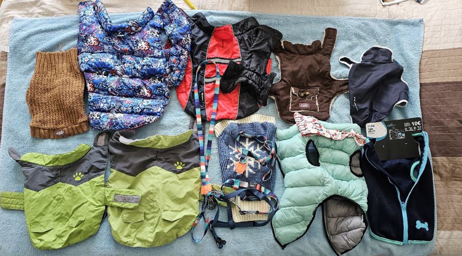 10 komada odjeće(jaknice,džemperi...)za manjeg psa (od 5-6 kg) neki komadi nisu ni nošeni. Trasportna torba d 35 š 25 v 25 cm , 2 hama i 1 uzica (nekorišteni) . Sve zajedno prodajem po fiksnoj cijeni od 20 eura.