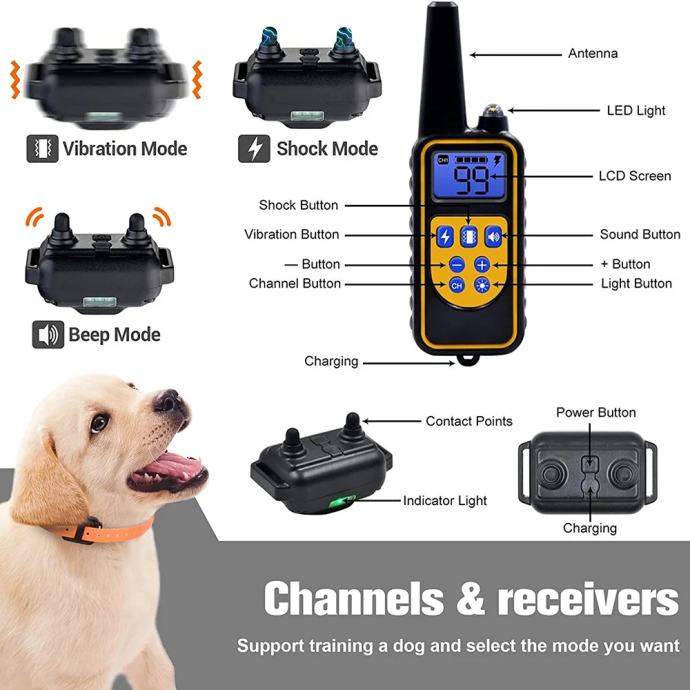 Ogrlica za sve veličine pasa sa ugrađenim baterijama, elektro inpulsom, vibracijom, zvučnim i svjetlosnim signalom.