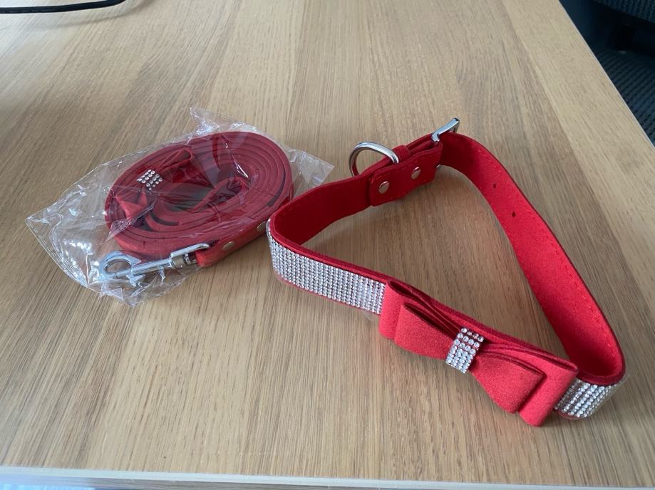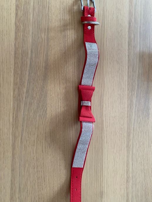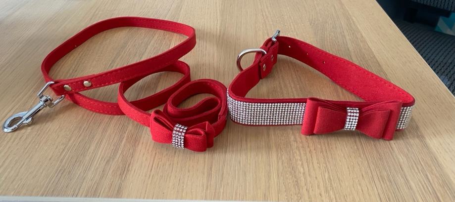 Ogrlica i povodac za manjeg psa ili mačku. Crvene boje sa mašnom i umjetnim dijamantima. Metalna kopča i imitacija brušene kože.