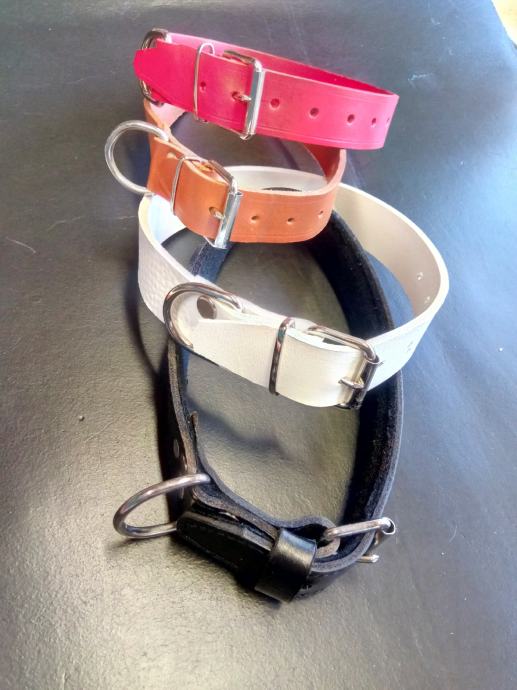 Kožna ogrlica , kože debele kvalitetne , razne boje , sa podstavom ili bez , širina 30 mm -35 mm , dužina 50 cm - 70 cm , metalni dijelovi čelični sigurni , novo , slanje poštom .
