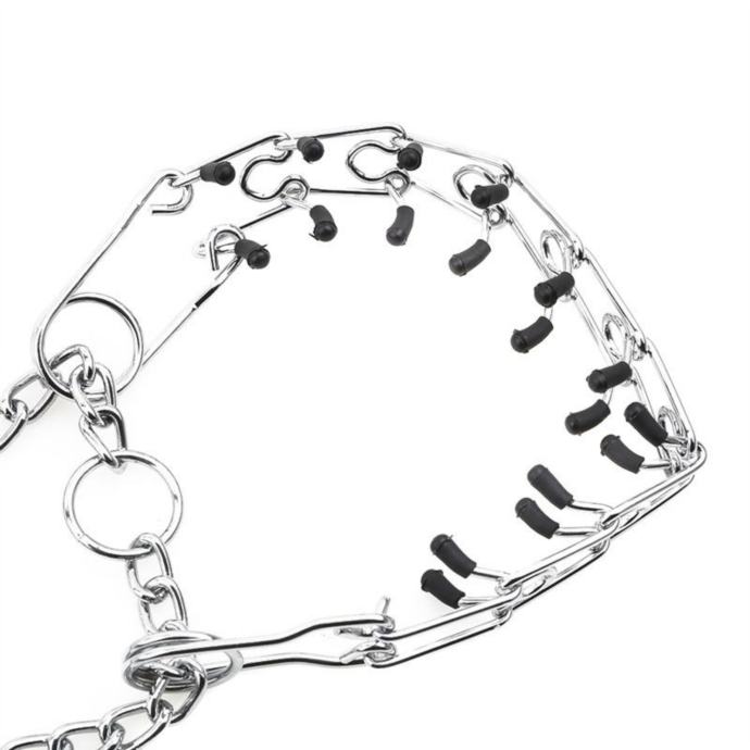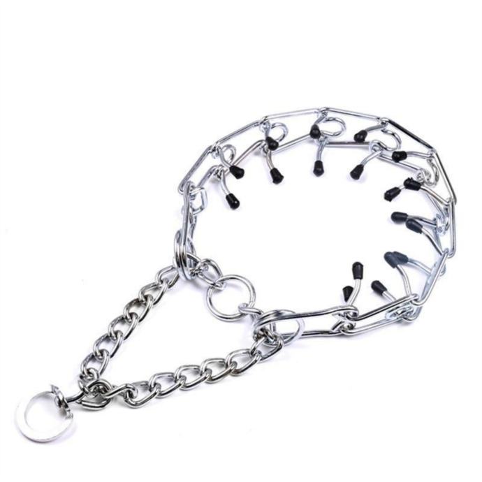 OGRLICA ZA DRESURU PASA, metalna, jako čvrsta i kvalitetna, sprječava psa da vuče vlasnika, može poslužiti kao zaštita vrata vašeg psa u slučaju napada drugog psa, primjenjiva za male i velike pasmine budući da se širina ogrlice može prilagođavati debljini vrata psa, dvostrana je budući da se kod dresure bodlje okreću prema tijelu psa, a inače bodlje se okreću prema vanka. Ogrlica je opremljena gumenim čepovima na bodljama što onemogućuje ozljeđivanje psa.
