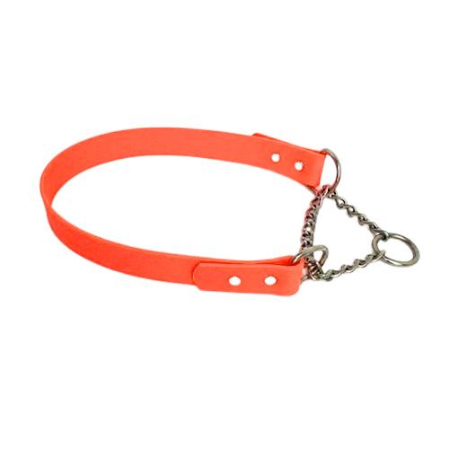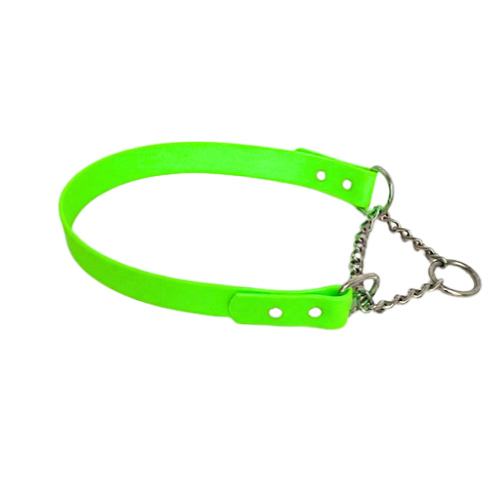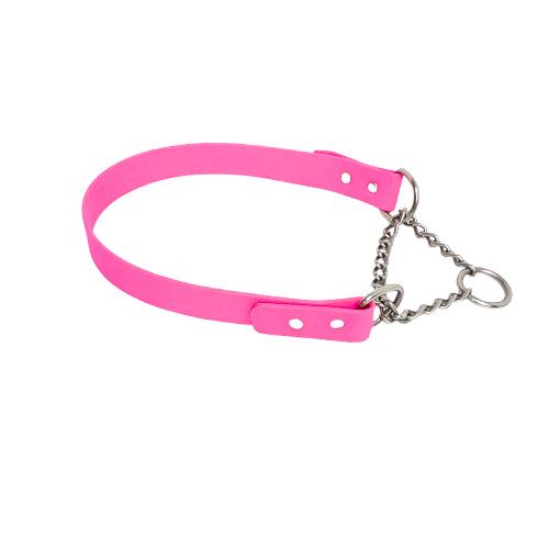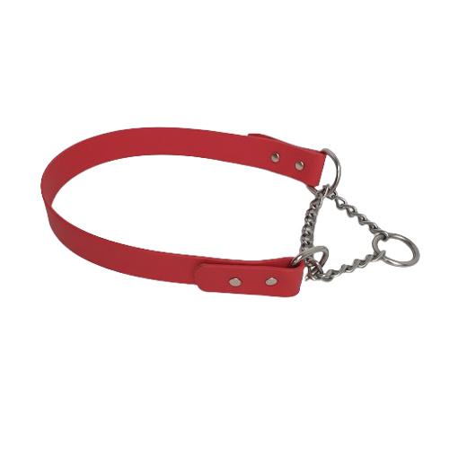 Ova poludavilica za pse izrađena je od BioThane trake široke 19mm i lanca od kromiranog čelika sa zavarenim alkama, za dodatnu sigurnost i dugotrajnost. Dužina ove ogrlice je 30cm, a lanac se zateže 10cm. Ogrlice izrađujemo po narudžbi. U ponudi su različite boje i dužine.