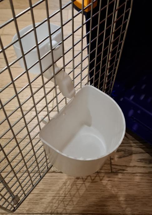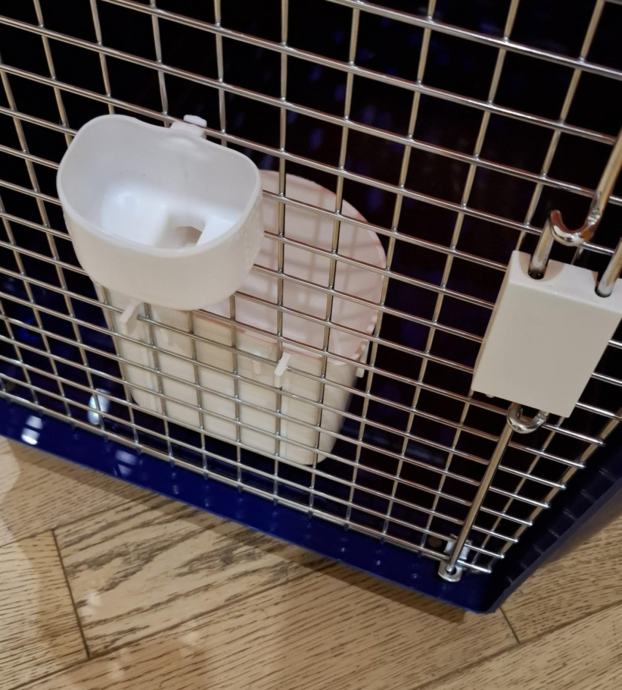 Izrađeno od tvrde plastike, s metalnim vratima. Kutija se može rastaviti na dva dijela koja su spojena metalnim vijcima. Uključen lijevak i zdjela za vodu. Vrata imaju čvrsti mehanizam zaključavanja, sa šiljcima koji se protežu u okvir vrata, što ih čini vrlo sigurnima.