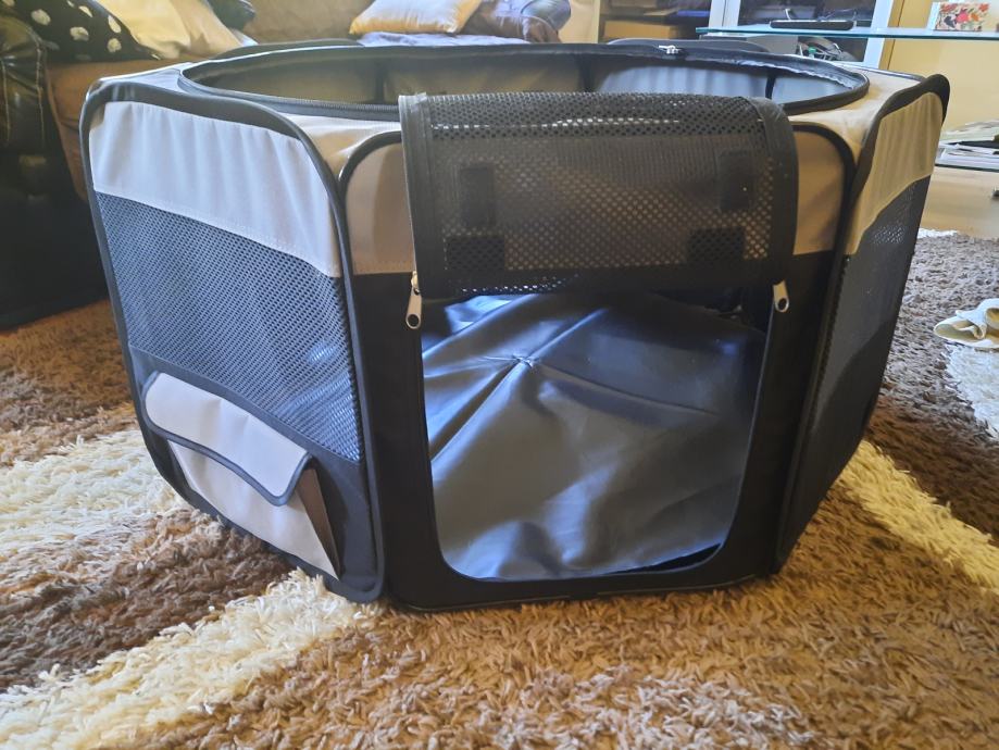 Prodajem prijenosni box za manje pse ili mačke 92x43. Praktičan za igru, spavanje, putovanje. Jednostavan za održavanje i slaganje.