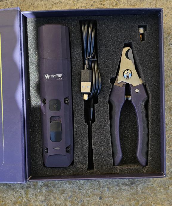 Set za njegu kandzi, sastoji se od baterijske bruslice, klijesta, cetke rezervnog brusa, i punjaca.