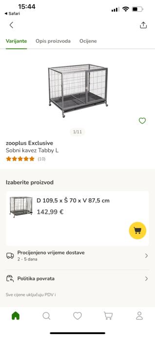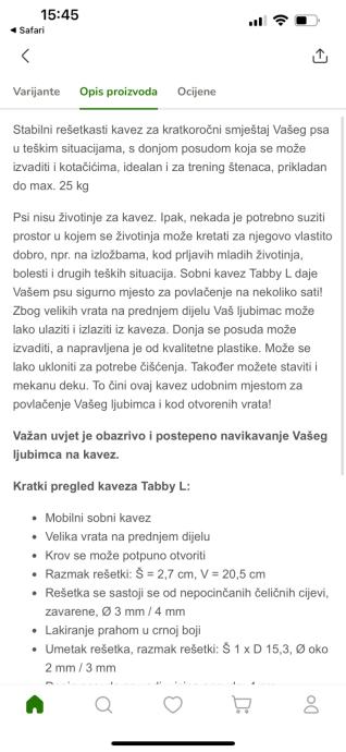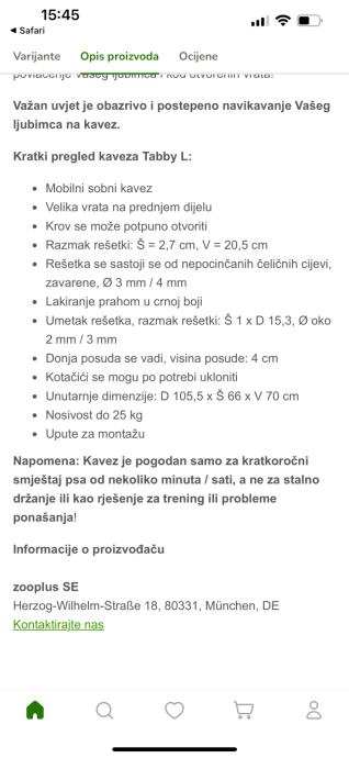 Sobni kavez “Tabby L” iz ZooPlus-a kupljen pocetkom godine kad je pas bio štene s ciljem da ga na kratko zatvorimo kad bi trebao ostati sam da ne vrši nuždu po stanu. Dresurom psa, kavez nam jednostavno vise nije potreban i zato ga prodajemo.