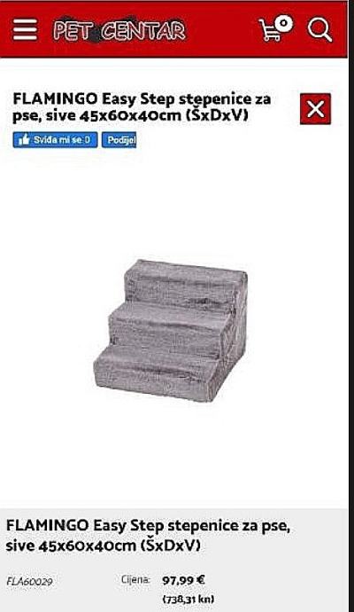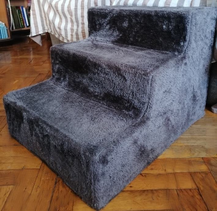 Stepenice za pse da se lakše uspinju na kauč. S navlakom koja se po potrebi može skinuti i oprati. U besprijekornom stanju, jer nisu puno korištene. Prodajem jer je psić imao operaciju noge, pa smo mu kupili niski ležaj. Dimenzije: Širina 45 cm, visina 40 cm, duljina 60 cm. Kupljene u Pet Centru.