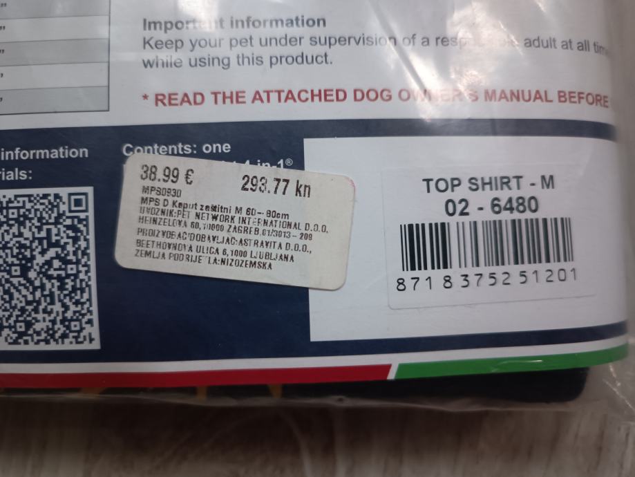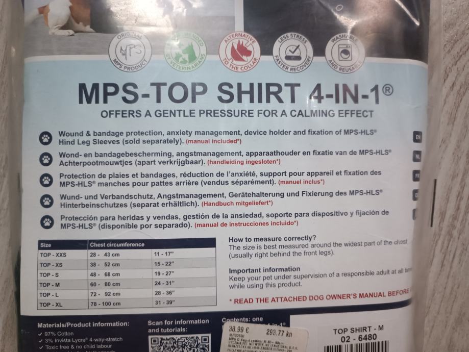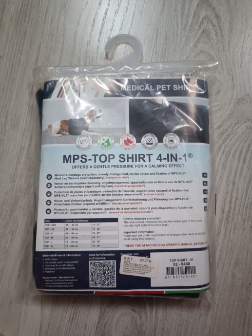 Upute za uporabu: proizvod MPS-TOP 4-u-1® oblači se tako da prvo navučete preko glave, a zatim provučete svaku prednju nogu zasebno u predviđene otvore. MPS-TOP 4-in-1® se pričvršćuje oko prsnog koša podesivim čičkom. Dobro provjerite oko nogu i vrata da vidite ima li dovoljno mjesta za kretanje i disanje.