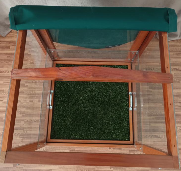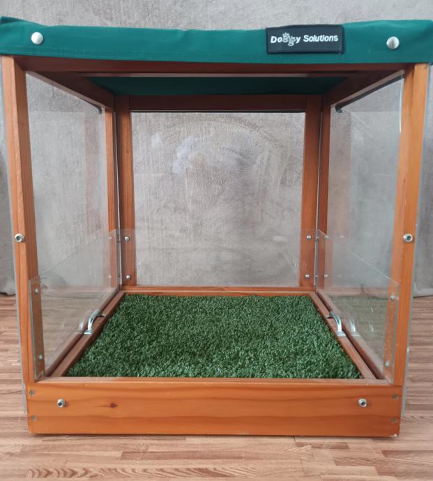 Toalet ima plexiglas stranice i nepropusni krovic koji se na drukere moze staviti ili maknuti ovisno o potrebi. Ako stoji wc na balkonu ili terasi onda je bolje imati krovic da ne pada kisa, ako stoji u stanu krovic nije potreban. Ima izvlacni dio gdje se nalazi umjetna trava posebne izrade ispod koje su rupice i kad se pas pomokri mokraca odlazi kroz rupice u pijesak na nivo ispod. Umjesto ove umjetne trave moze se staviti sloj sitnih oblutaka. Ispod te izvlacnog dijela gdje se nalazi umjetna trava stavi se pijesak za macke za lakse odrzavanje.