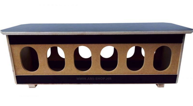 Hranilica sa ovalnim otvorima izrađena od vodootporne šperploče u crnoj boji.